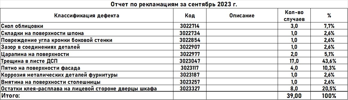 Например, для мебельной отрасли к третьй категории классификатора можно отнести такие претензии: