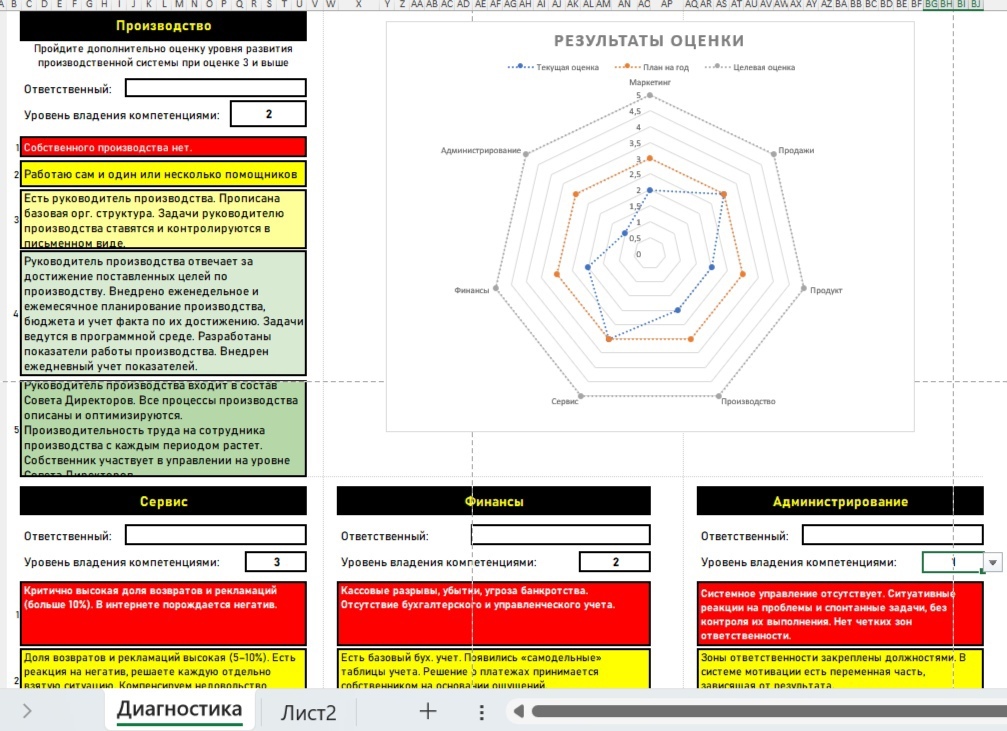 Я провожу не простую диагностику, а оргдиагностику, которая включает в себя анализ уровня развития культуры, анализ уровней развития системы управления и производственной системы, а также анализ уровня развития качества принятия решений и уровня развития компетенций сотрудников.