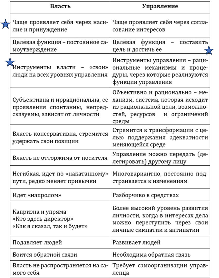 Посмотрите на таблицу со сравнением проявления особенностей власти и управления в поведении руководителя и в системе управления компании.