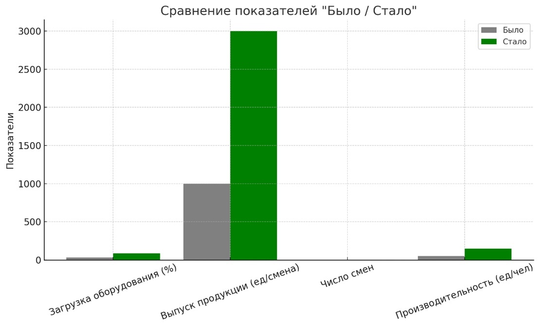 📍 После внедрения мониторинга и анализа причин простоев, нормирования сменных заданий и контроля загрузки — оборудование стало работать на 87% мощности, выпуск увеличился почти в 3 раза без дополнительного персонала и смен.